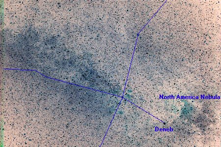 This is the Northern Cross asterism in the constellation Cygnus. It lies along the Milky Way and is in the direction along the Orion arm of our galaxy. This arm is where our solar system is located within the Milky Way Galaxy. Diagonally along this image can be seen a dense region of stars populating this spiral arm and above this can be seen a dark rift of obscuring dust clouds. The reddish patch seen to the lower right in the image is the North America Nebula (NGC7000), so called because of its distinctive shape. The outline of the constellation Cygnus and NGC7000 are shown in the annotated negative of this image below. This image is from a 40-minute exposure on hypered Fuji G800 with a Nikon N2000 and Nikkor 150mm lens at f/4.