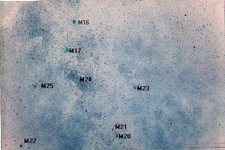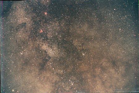 This is the Milky Way in the direction of Sagittarius. This image is rich in Messier nebulae and star clusters as shown in the labeled negative image of this field shown below. M16 is the Eagle Nebula, M17 is the Omega Nebula. This image is a 30-minute exposure on hypered Fuji HG800 with a Nikon N2000 and a Nikkor 210mm lens at f/4.