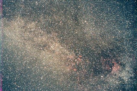 This is the Northern Cross asterism in the constellation Cygnus. It lies along the Milky Way and is in the direction along the Orion arm of our galaxy. This arm is where our solar system is located within the Milky Way Galaxy. Diagonally along this image can be seen a dense region of stars populating this spiral arm and above this can be seen a dark rift of obscuring dust clouds. The reddish patch seen to the lower right in the image is the North America Nebula (NGC7000), so called because of its distinctive shape. The outline of the constellation Cygnus and NGC7000 are shown in the annotated negative of this image below. This image is from a 40-minute exposure on hypered Fuji G800 with a Nikon N2000 and Nikkor 150mm lens at f/4.
