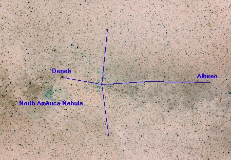 This is the Northern Cross asterism in the constellation Cygnus. It lies along the Milky Way and is in the direction along the Orion arm of our galaxy. This arm is where our solar system is located within the Milky Way Galaxy. Horizontally along this image can be seen a dense region of stars populating this spiral arm and below this can be seen a dark rift of obscuring dust clouds. The reddish patch seen to the left in the image is the North America Nebula (NGC7000), so called because of its distinctive shape. This image is a 19 August 1995, 20-minute exposure on hypered Fuji Super HG400 with an Olympus OM-1 and 50mm lens at f/2.8.