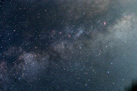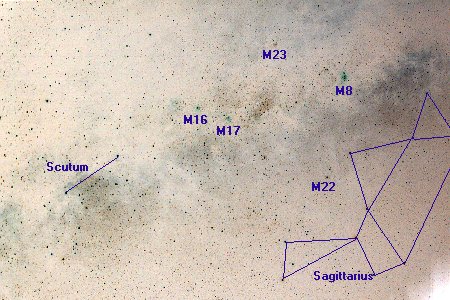 This is the Milky Way in the direction of Sagittarius and Scutum and is the view toward the center of our galaxy. This image is 20-minute exposure on hypered Fuji Super HG400 with an Olympus OM-1 and a 50mm lens at f/2.8. The annotated negative image of this field shows the outline for the constellations Sagittarius and Scutum and also shows the locations of the Eagle Nebula (M16), the Omega Nebula (M17), and the Lagoon Nebula (M8) all which are visible in this photograph. Also visible are the open cluster M23 and the globular cluster M22. The dark patch at the lower right are blurred tree tops at my horizon.