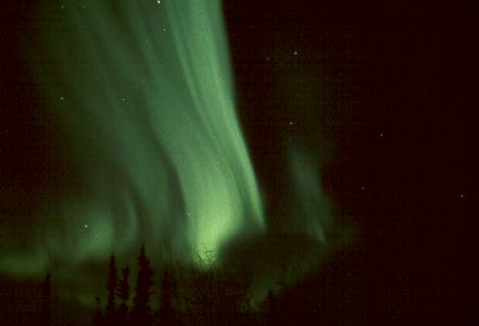 Aurora with Hyades in background. (Look just above the treeline to the left).
