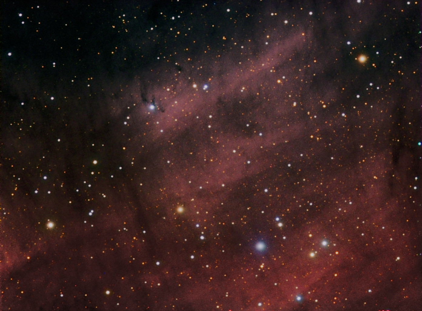 IC 5068 is an emission nebula which is a region of hydrogen gas that faintly emits from energy imparted by nearby stars. The nebula is located very close to the more famous Pelican Nebula and North American Nebula, all located in the constellation Cygnus.